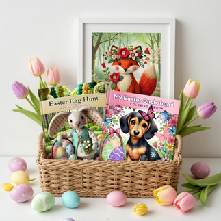 Cozy Critter seasonal gift bundles pair illustrated storybooks with matching wall art and creative activities—perfect for Easter baskets, Christmas gifts, and dachshund lovers.